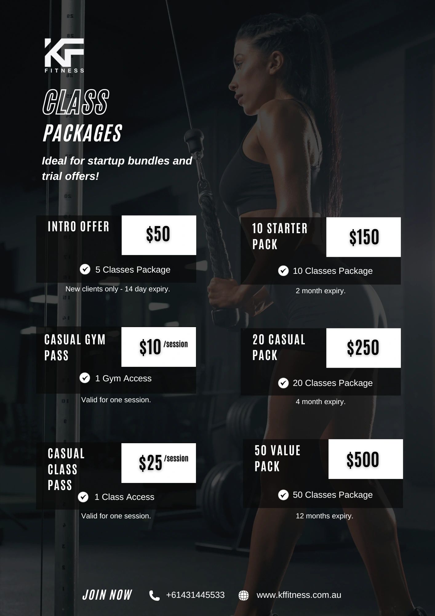 To purchase a package, please head to our KF Fitness app and purchase the package you prefer.